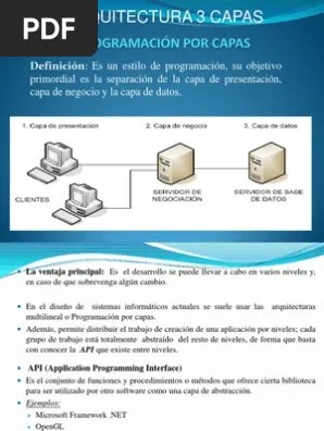 En primer lugar, me hallo en la construcción de una api rest en asp.net y estoy usando la arquitectura 'n' capas, he optado por tener la capa del controlador, una capa que he llamado servicios donde se incluye la lógica de negocio y una capa llamada data donde se ….. Arquitectura 3 capas programación por capas definición: Es un estilo de programación, su objetivo primordial es la separación de la capa de presentación, capa de negocio y la capa de datos. Es decir, los distintos componentes están en máquinas separadas.